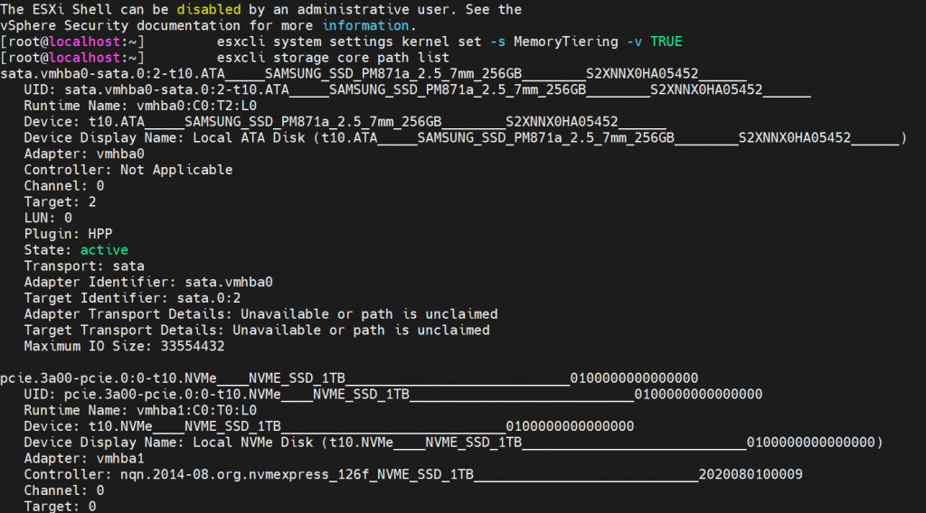 [root@localhost:~] esxcli system tierdevice create -d /vmfs/devices/disks/t10.NVMe____NVME_SSD_1TB____________________